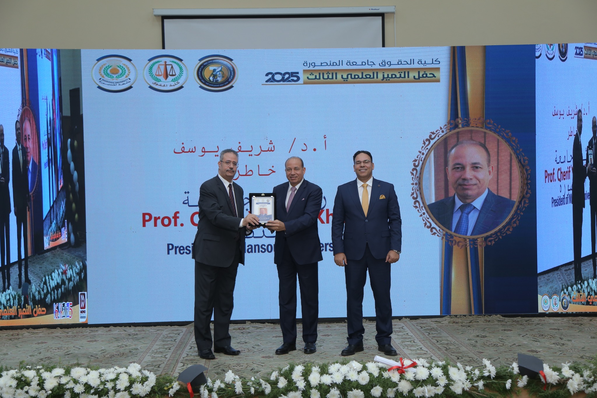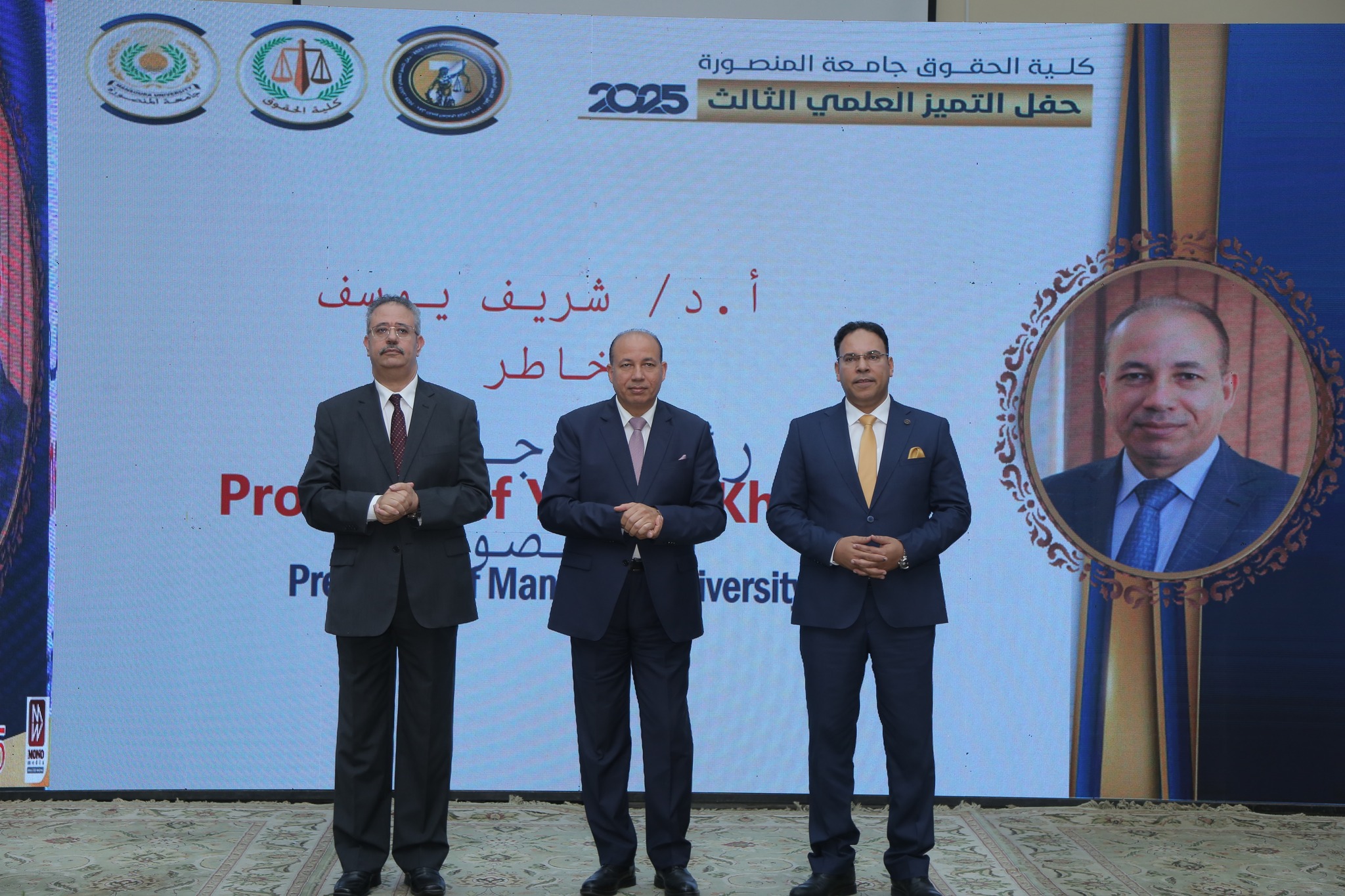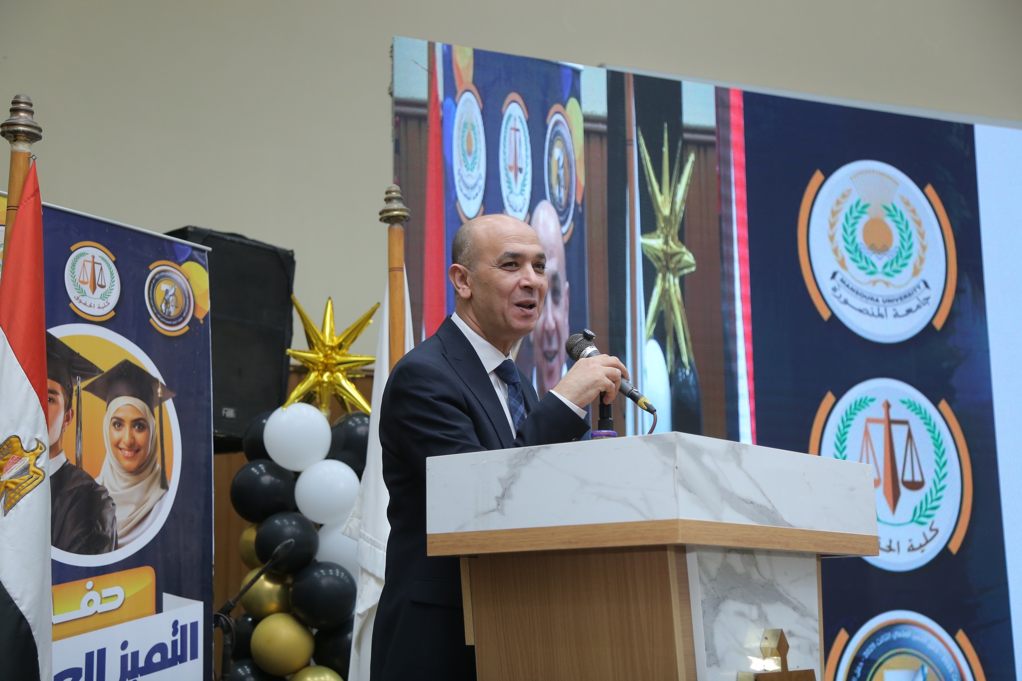 وخلال كلمته في الاحتفال، أكَّد الدكتور شريف خاطر أن كلية الحقوق بجامعة المنصورة "ليست مجرد مؤسسة تعليمية، بل قيمة ومعنى، ومدرسة راسخة في تشكيل الفكر القانوني المسؤول الذي يربط بين المعرفة والغاية، وبين النص والعدالة"، مشيرًا إلى أن يوم التميز العلمي "مناسبة نحتفي فيها بالعلم وأهله، ونقرأ من خلالها عامًا كاملًا من العمل والبحث والتحصيل".