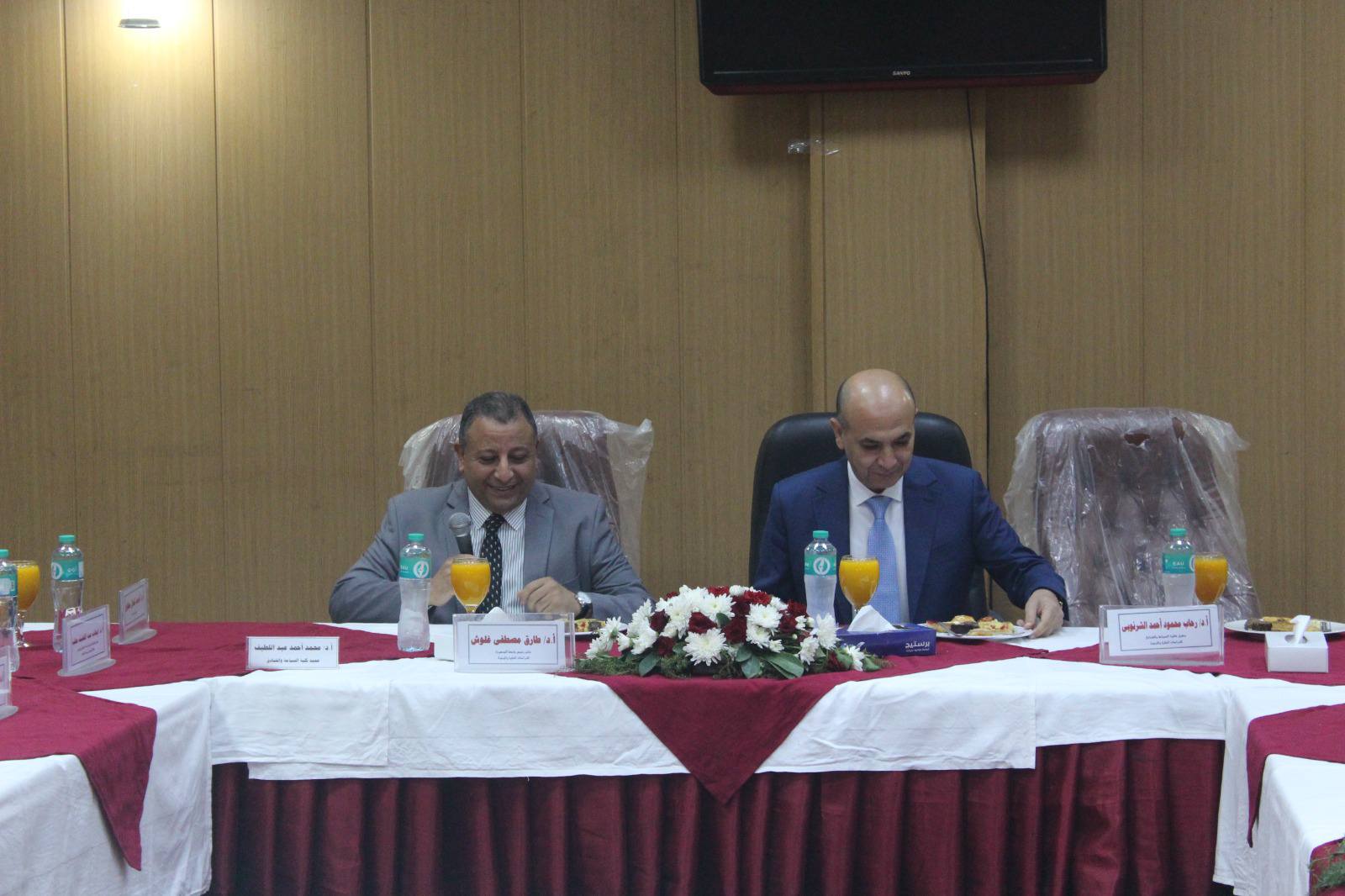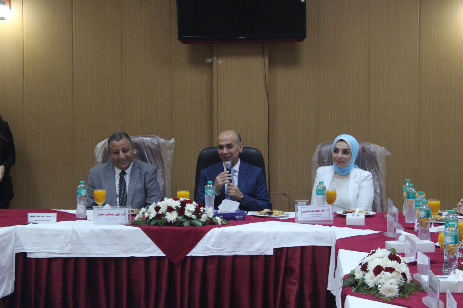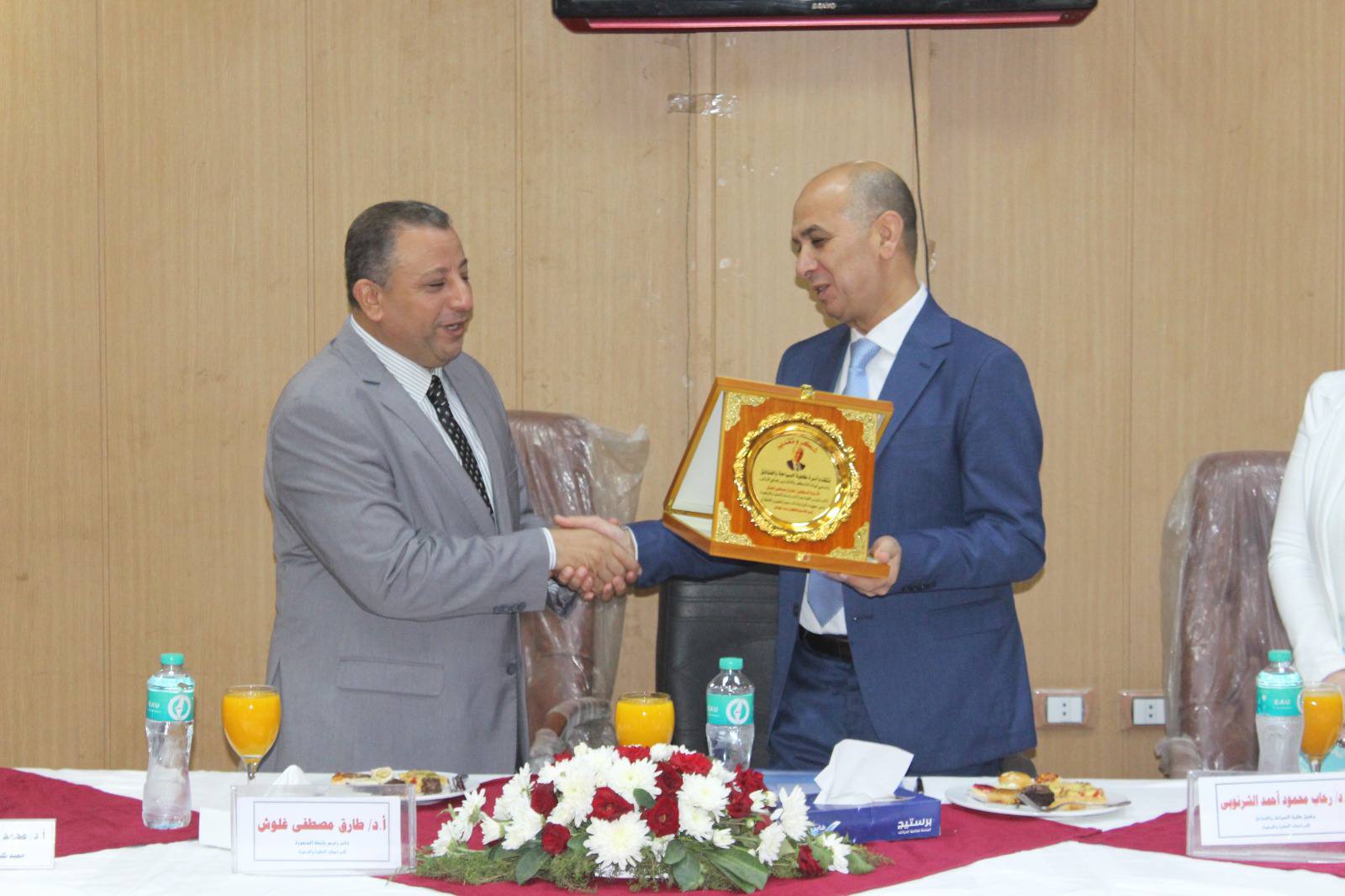في بداية الجلسة، رحب أ.د. محمد عبد اللطيف بالسيد نائب رئيس الجامعة والسادة الحضور. وتقديراً لجهود سيادته في الارتقاء بالعملية التعليمية وتطوير قطاع الدراسات العليا، قدم عميد الكلية درع الكلية إلى أ.د. طارق غلوش.